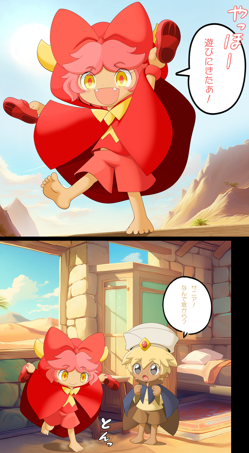 こわ~い姉を無事(?)やり過ごしたサニアちゃんは翼を広げ、空を飛んで砂漠のアルフ君の家に向かいました。