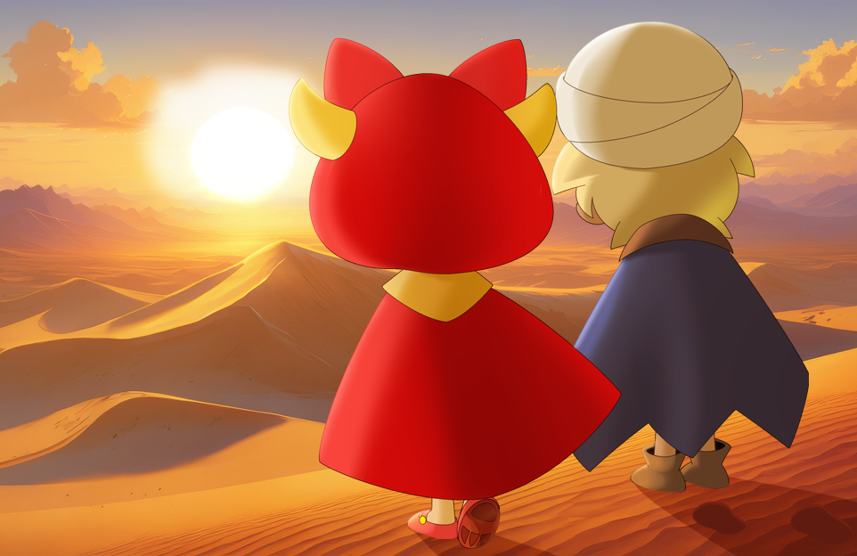 幼い二人は日が暮れるまで遊んで汗をかいた後、砂漠の向こうに沈んでいく夕日を一緒に見ました